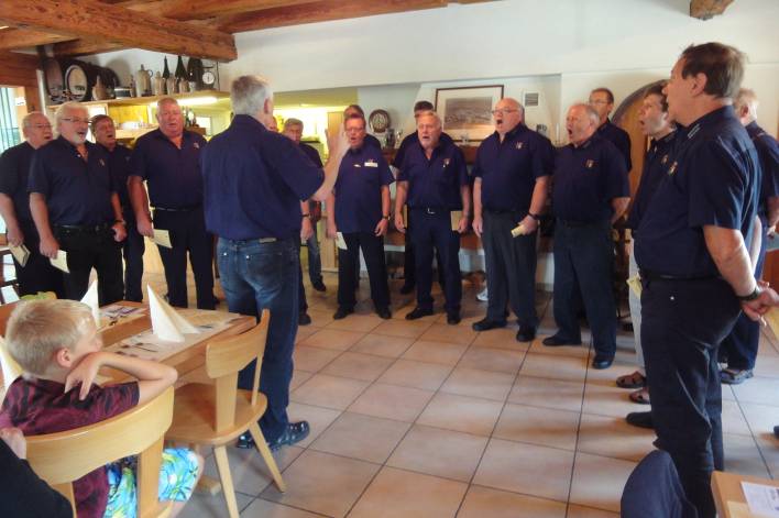 Im Speisesaal singen wir unseren Frauen und einer anwesenden Gruppe ein Ständchen. Was wir nicht wussten, diese Gruppe waren taubstumme Leute, sie hörten von uns keinen Ton, verstanden aber dank einer Übersetzerin in Gebärdesprache den Text und applaudierten kräftig.