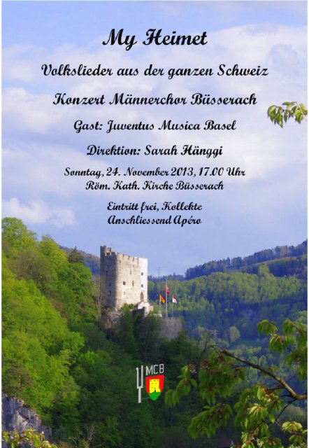 Unter diesem Leitgedanken führte unser Männerchor am Sonntag, den 24. November 2013, einen Konzertanlass in der Kirche zu Büsserach SO durch. Manche Männerchörler zweifelten im Vorfeld an sich selbst, denn es war nicht immer einfach für unsere Dirigentin Sarah Hänggi aus Breitenbach, uns ihre Sprachkünste in allen Nationalsprachen zu vermitteln. Umso grösser war dann die Freude über die gelungene Leistung. Unser Präsident Ewald Dreier durfte weit mehr als 300 Musikfreunde begrüssen. Aber nehmen wir den Schlund nicht zu voll. Das missliche Wetter hat „vielleicht“ auch etwas zum Erfolg beigetragen. Die Volkslieder in allen Nationalsprachen begeisterten aber offenbar die Besucher. Als Gast traten acht Mitglieder des jungen Chor- und Orchestervereins Juventus Musica Basel unter dem Dirigenten Raphael Ilg auf. Sie meisterten mit Bravour das Holzbläseroktett von Ludwig van Beethoven.Wir spürten den positiven Nachhall beim anschliessenden Apéro im Restaurant Reh, wo uns zwei Welschfreiburger, Mitglieder eines Jugendchores unserer Dirigentin, noch mit einer Zugabe mit dem Lied „Lioba Ranz des Vaches“ (Kuhreihen) überraschten. Dieses Lied ist eines der bekanntesten Lieder der Eidgenossen und wurde schon im 16. Jhd gesungen. Wir bedanken uns herzlich bei unserem Gastorchester und für die Geduld unserer Dirigentin Sarah Hänggi. Vielen Dank auch den Besuchern und Besucherinnen für ihre lautstarke Begeisterung und den freiwilligen finanziellen Beitrag.