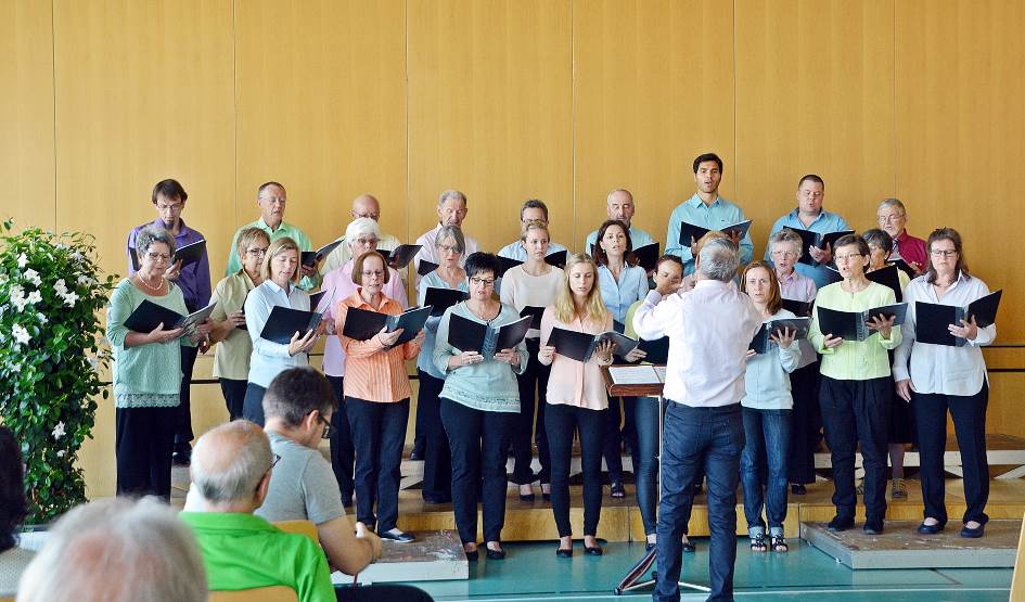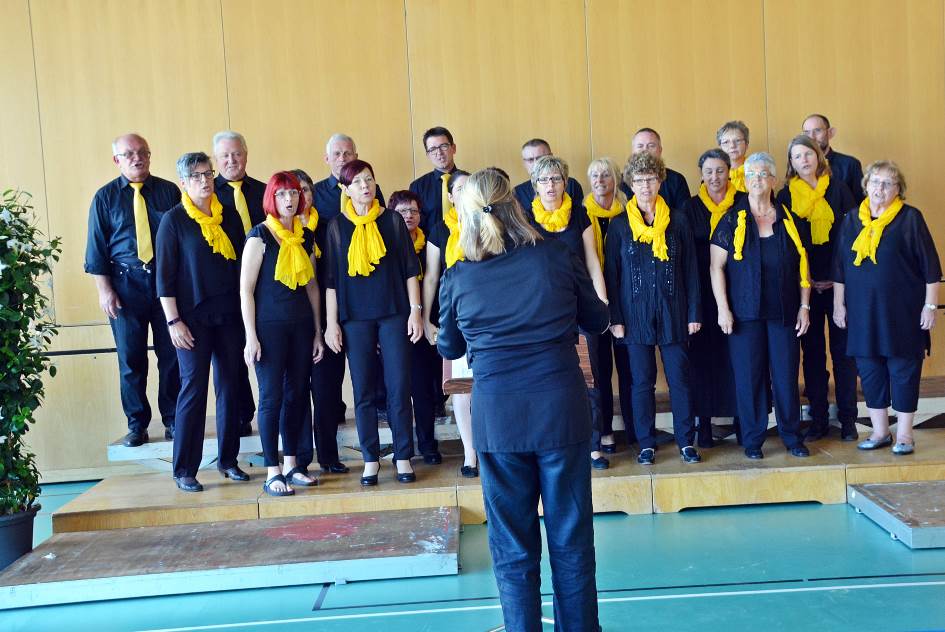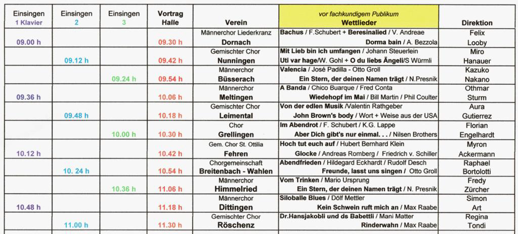 Der MC Liederkranz Dornach etwa huldigte in der am Samstag eher selten gewordenen Spezies der Trinklieder aus vollen Kehlen Bacchus, dem Gott des Weins: „Schenk ein, bis die (Leimentaler) Welt sich dreht“. Der MC Himmelried hingegen rief in seinem Lied „Vom Trinken“ zur Mässigkeit auf. Ganz der Klassik verschrieb sich der Gemischte Chor Fehren, der mit dem festlichen „Hoch tut euch auf“ nochmals an sein erfolgreiches Passionskonzert vom Frühjahr anknüpfte. Traditionellen Männerchorgesang servierte die Chorgemeinschaft Breitenbach-Wahlen mit ihrem flammenden Aufruf “Wohlauf ihr Freunde lasst uns singen, denn das Leben macht uns froh!“ Nicht nur froh mit dem „Glory Halleluja“, sondern geradezu mitreissend hörte sich der US-Marschsong „John Brown‘s body“ an, den der Gemischte Chor Leimental mit viel Einsatz zum Besten gab. Evergreens, Hits und Humor kommen beim Publikum immer bestens an, hatten mehrere Chöre richtig spekuliert. So der Männerchor Büsserach, der wie auch die Himmelrieder Sänger mit DJ Ötzis „Ein Stern, der deinen Namen trägt“ für Begeisterung sorgte. Da wollten die ihre 40 Jahre feiernden Meltinger Sänger nicht hintenan stehen. Ihre deutsche Version von „Puppet on a String“ mit dem kuriosen Titel „Wiedehopf im Mai“ schlug beim Publikum so richtig ein. Genauso wie „kein Schwein ruft mich an“ des MC Dittingen, das neckische „O du liebs Ängeli“ des Gemischten Chors Nunningen oder der einstige Flippers-Titel „Aber Dich gibt’s nur einmal für mich“, den der Chor Grellingen wohl auch in Anspielung auf sein anstehendes Dorffest sang.